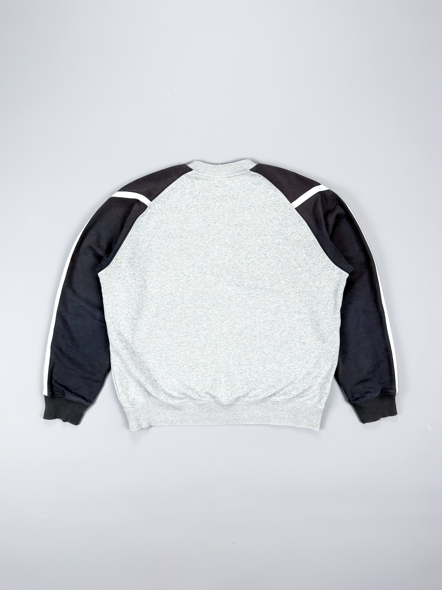 Grey body with black sleeve, white stripes and a Suede-like logo on the chest.