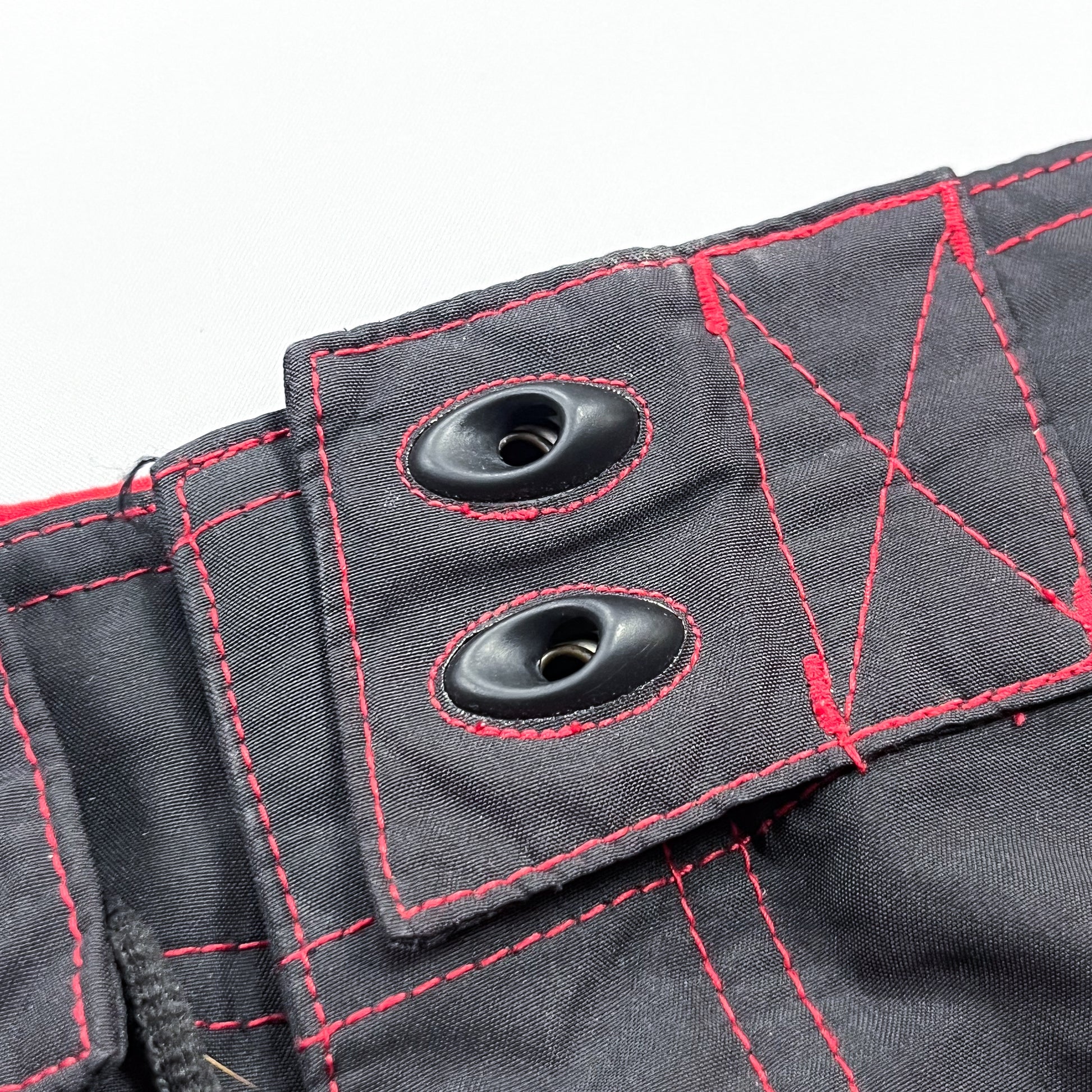 Black body with Red contrast stitching and the flame skull design on the outside of both legs.